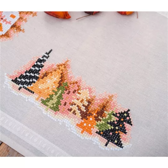 The kit contains an ecru 100% cotton table runner with inwoven hem and printed design, DMC stranded cottons, needle, stitch chart and instructions. Uses cross stitch and back stitch.