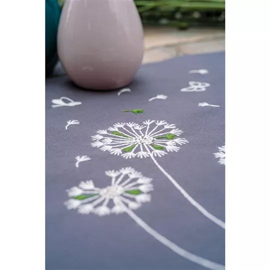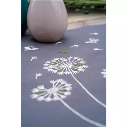The kit contains pre-finished dark grey cotton table mats with printed design, DMC stranded cottons, needle, stitch chart and instructions. Uses long stitch, loop stitch, satin stitch, stem stitch and french knots.
