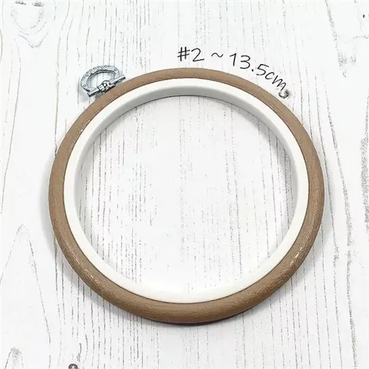 This hoop measures 13.5cm around the outer edge (5.3 inches) and the outer ring is sand or a light wood effect in colour.