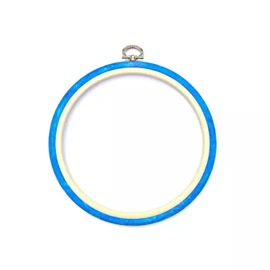 This hoop measures 17cm around the outer edge (6.75 inches) and the outer ring is blue in colour.