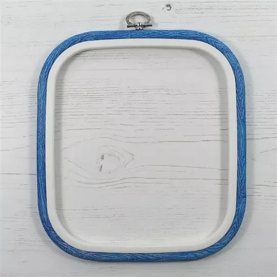 This square hoop measures 18cm x 20cm around the outer edge (7 x 8 inches) and the outer ring is blue in colour.