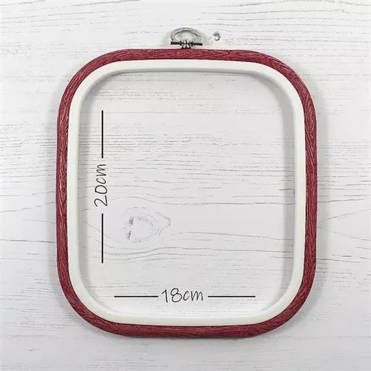 This square hoop measures 18cm x 20cm around the outer edge (7 x 8 inches) and the outer ring is red in colour.