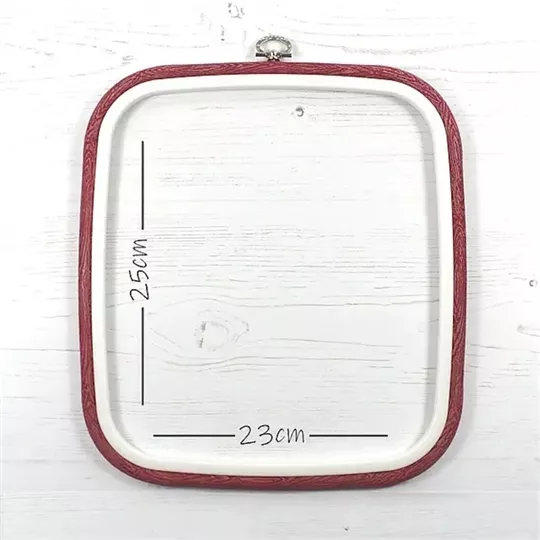 This square hoop measures 23cm x 25cm around the outer edge (9 x 10 inches) and the outer ring is red in colour.
