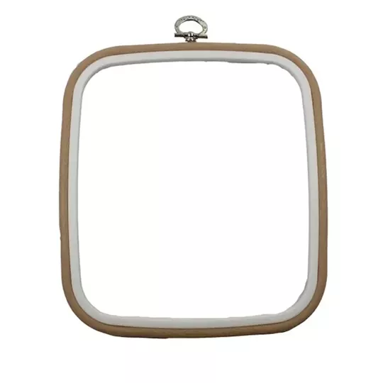 This square hoop measures 23cm x 25cm around the outer edge (9 x 10 inches) and the outer ring is sand or light wood in colour.