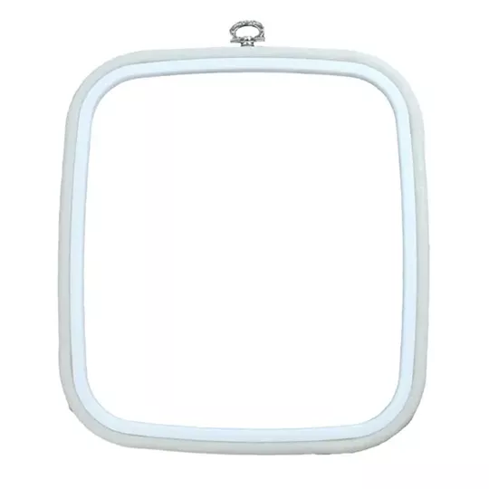 This square hoop measures 23cm x 25cm around the outer edge (9 x 10 inches) and the outer ring is white in colour.